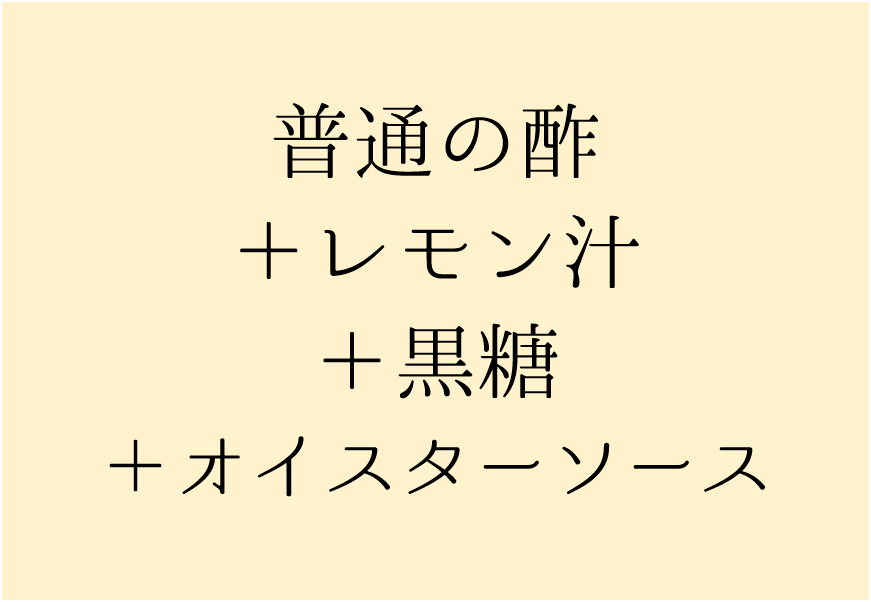 ✔ より黒酢に近い風味を出したいのであれば、少し手間ですが「普通の酢+レモン汁+黒糖+少々のオイスターソース」を混ぜ合わせるのがおすすめ。