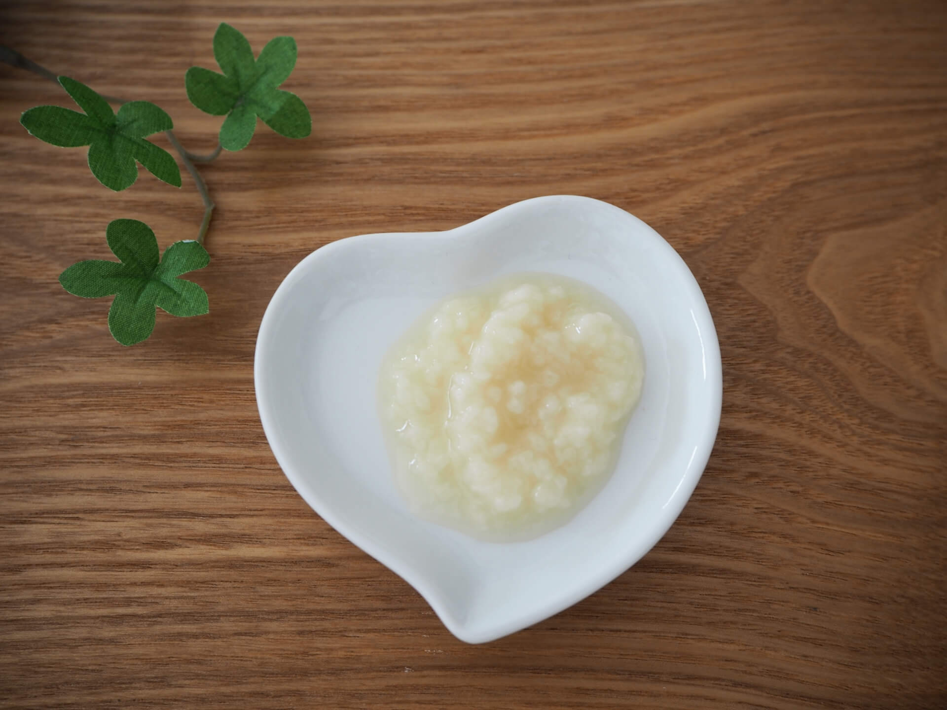 - 小さめのフライパンにオリーブオイルを入れて熱し、ニンニク(すりおろし)を炒めます。