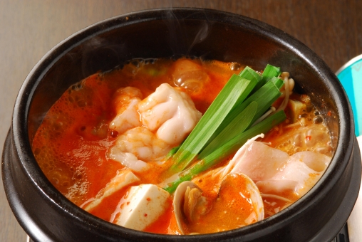 白菜キムチベースのスープに肉や魚介類を入れて、野菜や豆腐などお好みの材料を加えて煮込みます。辛さの調節はお好みでどうぞ!