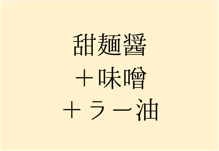 先ほどのパターンとは違い、「甜麺醤はあるけど、豆板醤がない…」というときは甜麺醤と味噌、そして「ラー油」を使いましょう。
