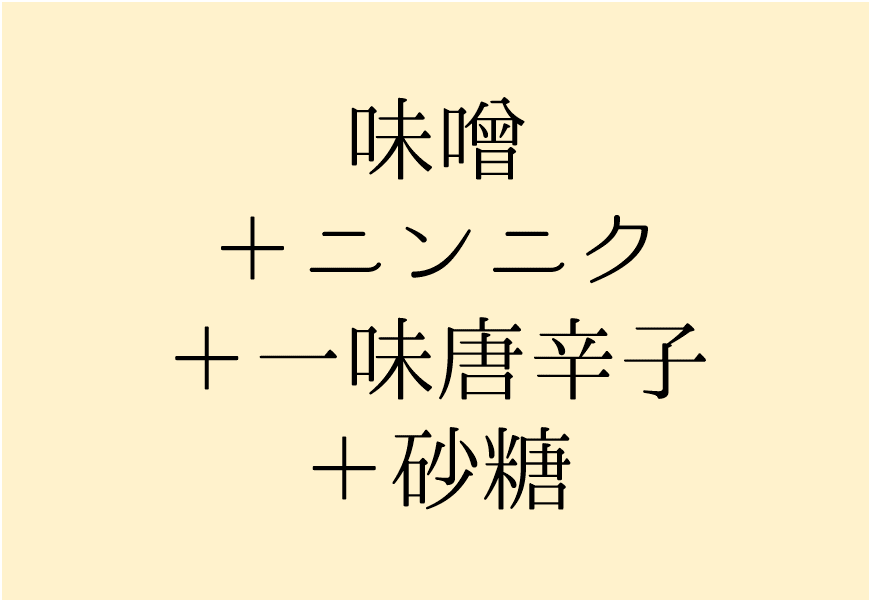そんな代用品作りに必要な調味料は、味噌とニンニク、一味唐辛子、砂糖です。