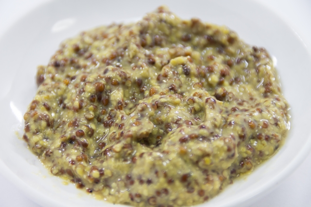 マスタードシードを酢などの調味液に漬けこんで作る粒マスタード。