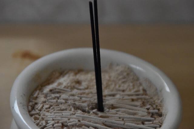 お線香が最後まで焚けるよう、器に敷く灰のことです。