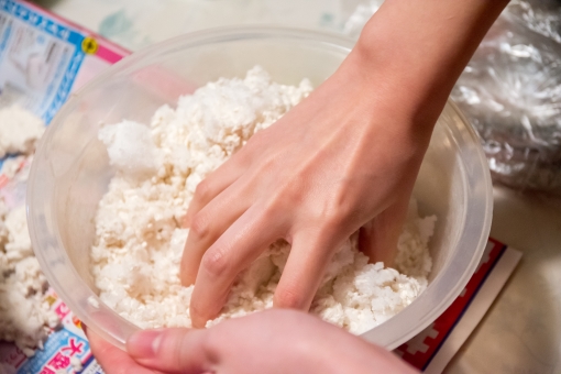 塩麴は、塩と麴と水を合わせて1週間程発酵させて作られている「白くドロッとした調味料」になります。