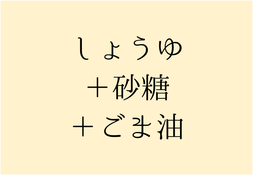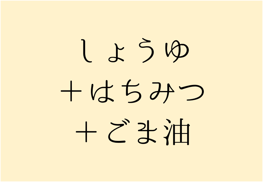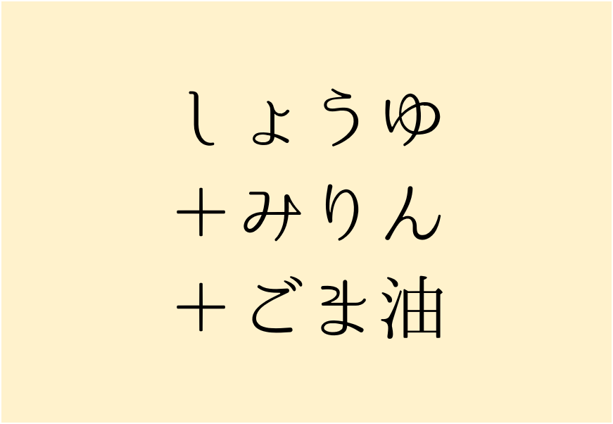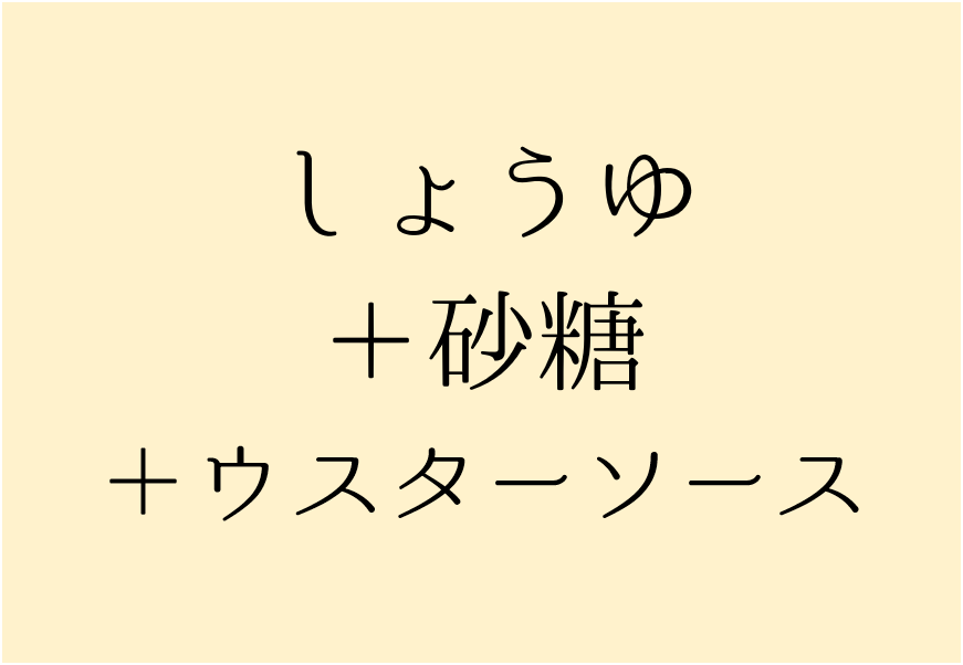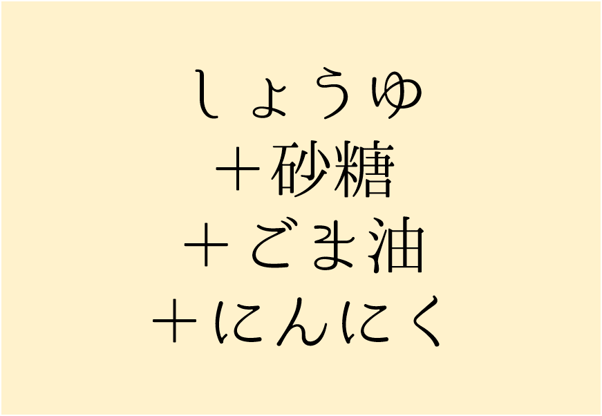 【醤油+みりん+ごま油、醤油+はちみつ+ごま油、醤油+砂糖+ごま油、醤油+砂糖+ウスターソース、醤油+砂糖+りんごジュース、醤油+砂糖+ごま油+にんにく】